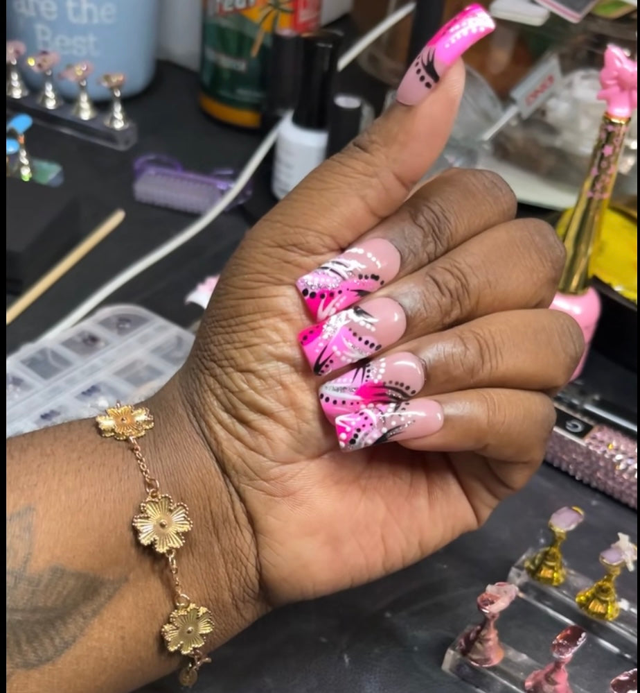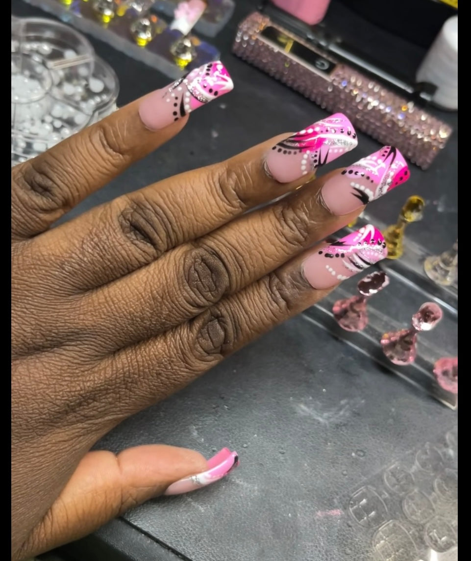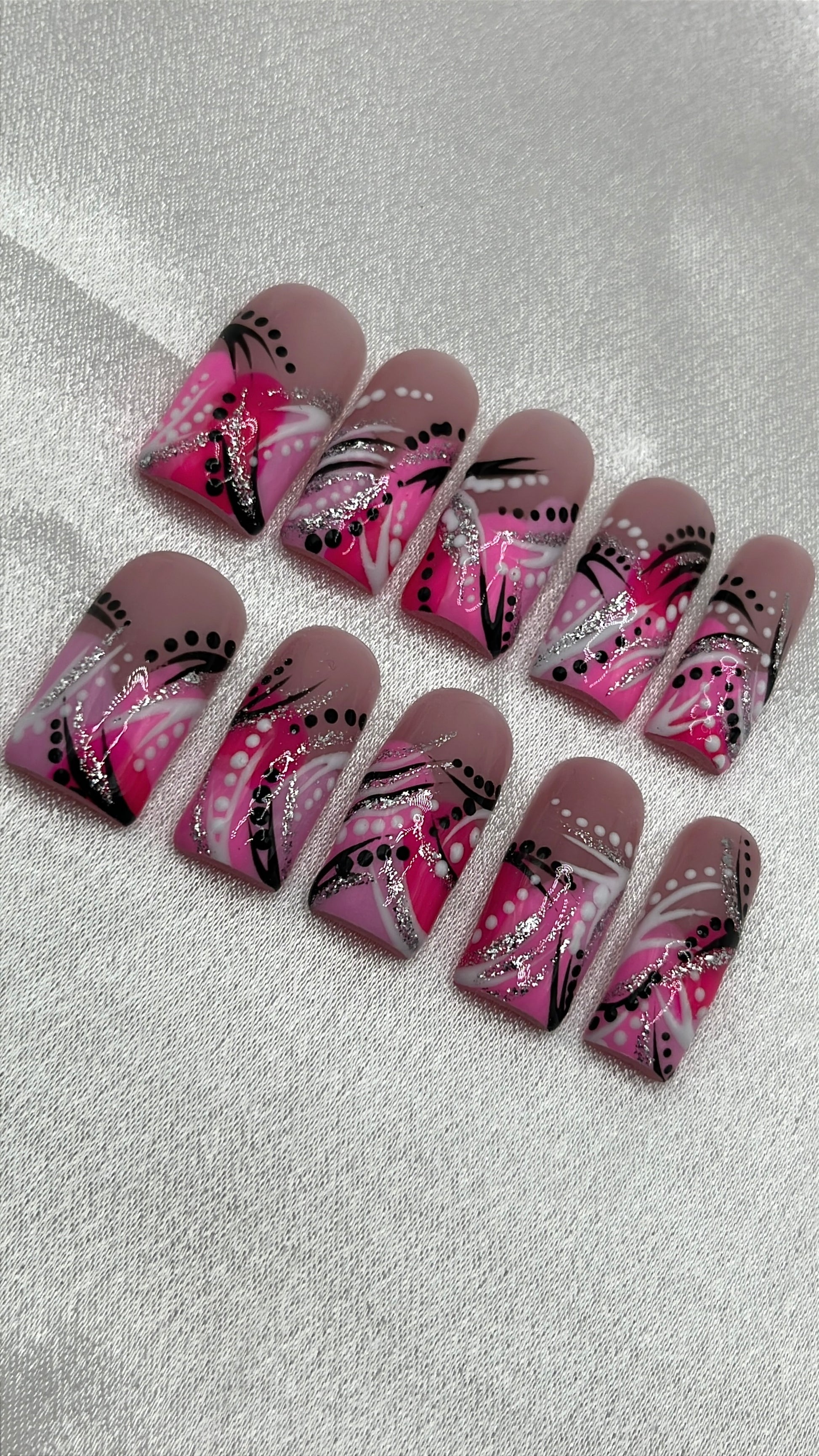 Bold and eye-catching, this curved square set features a pink-to-nude ombré base with abstract black and white swirls, silver glitter accents, and dotted detailing. A fun, glam look with a touch of Y2K flair.