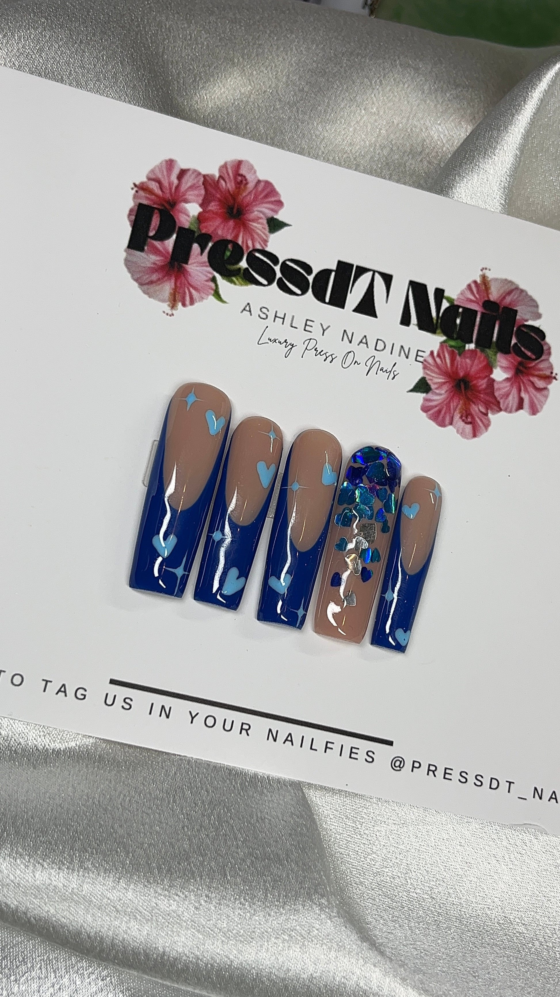Glossy nude press-on nails with bold cobalt blue French tips, hand-painted baby blue hearts, and a sparkling heart accent nail. A chic, modern Valentine’s Day set perfect for date nights and romantic moments.