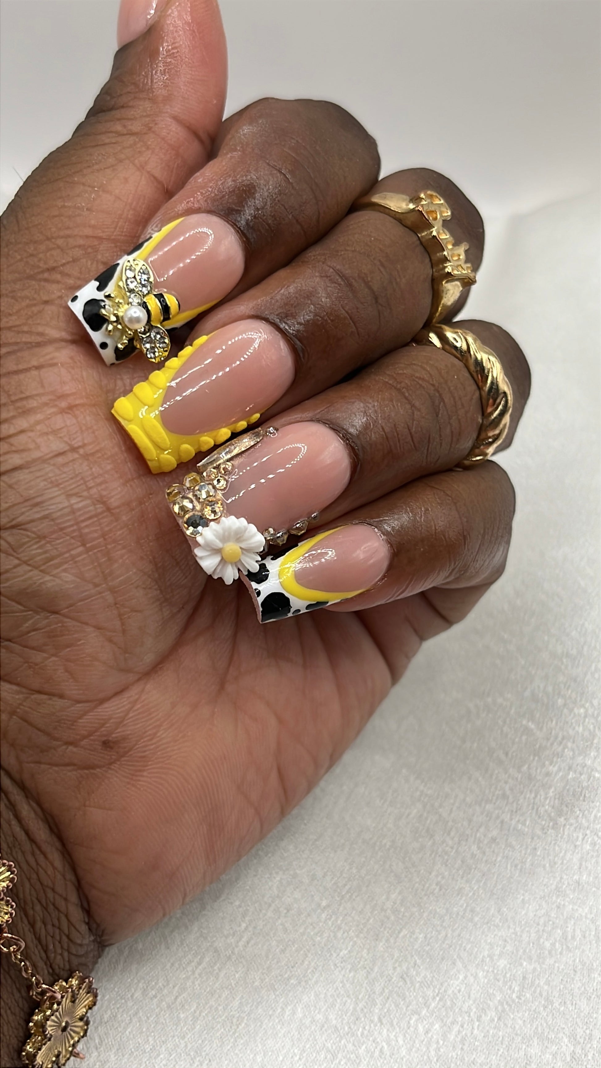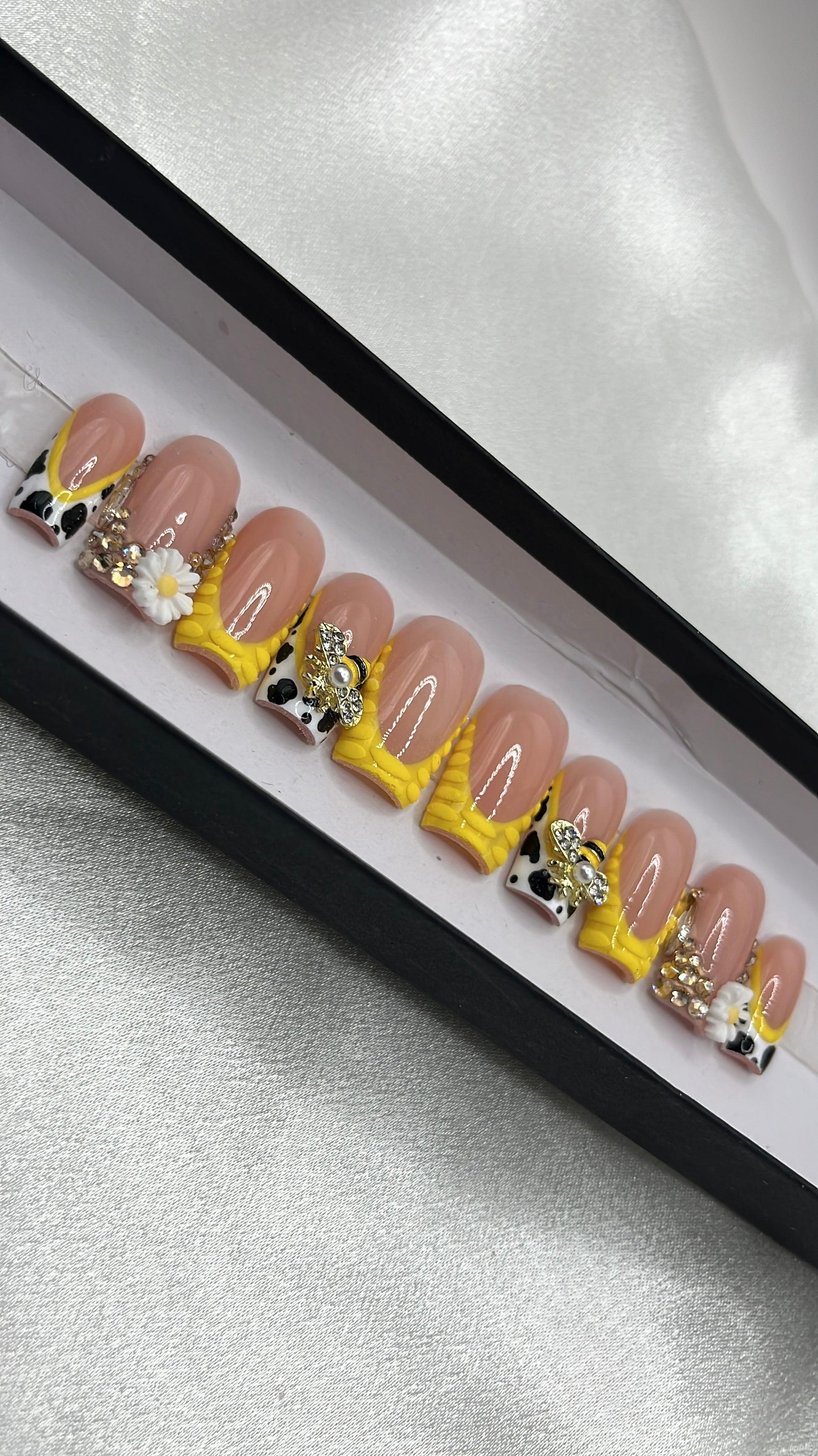 Buzz into bold style with this vibrant and playful press-on nail design. Featuring a stunning mix of yellow accents, cow print tips, and 3D embellishments, this set includes a sparkling rhinestone bee, daisy florals, gold crystals, and textured details for a look that’s full of personality and flair. Perfect for summer, festivals, or anytime you want to turn heads with a fun and fearless mani.